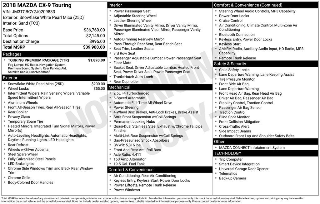 Snowflake White Pearl Mica 2018 Mazda CX-9 Touring 4D Sport Utility AWD 6-Speed Automatic 2.5L 4-Cylinder
